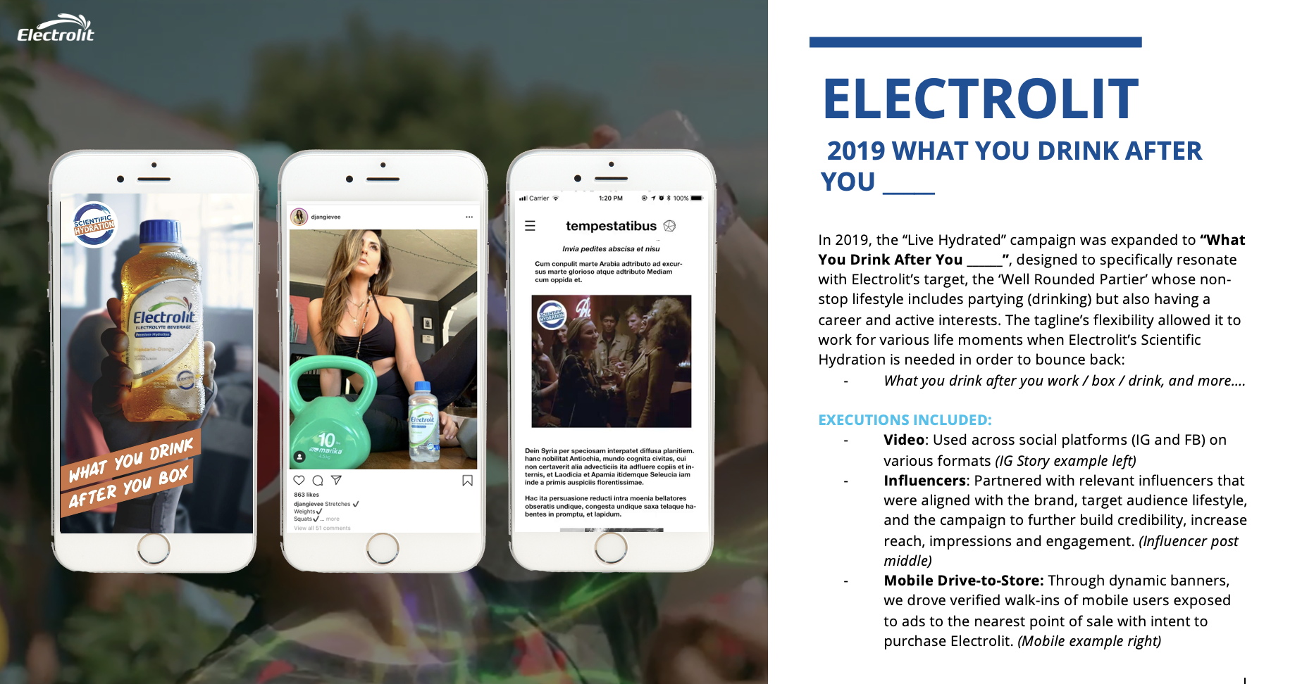 Ensured consistent brand voice and clear product benefits highlighting Electrolit’s electrolyte replenishment and hydration performance.